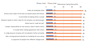 This data reflects the true impact of what happens when leaders work hard to give credit to others. The reality is, when a leader makes another person look good, it makes them look good too. The analysis on this data strongly suggests that by giving others credit a leader will be perceived in the following ways: more effective in their overall leadership effectiveness, fairer, committed to helping others succeed, does what is best for the company, walks their talk, accepts responsibility, is trusted, lives their principles and core values, and values diversity.